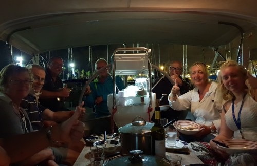 Auf dem Steg wächst die Gemeinschaft der 8 startenden Boote immer mehr zusammen. Man unterstützt sich und tauscht Erfahrungen aus. Am Donnerstag steigt dann unsere Stegparty. Jede Crew kocht etwas und jeder geht von Boot zu Boot und probiert, was es so bei den anderen gibt. Es wird viel gelacht, gegessen und getrunken – wieder ein schöner Abend.