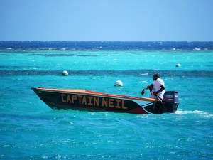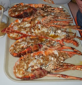 Tagsüber schwimmen wir im türkisenen Wasser und diskutieren viel. Angela liebt es, wenn ich sie schnorchelnd entlang der Riffkanten mit einer langen Leine hinter dem Dinghi herziehe. Sie bewundert die Unterwasserwelt und kann gar nicht genug davon bekommen. Abends essen wir Langusten an verschieden Orten. Ich stelle fest, dass Frischegrad und Geschmack deutlich variieren. Bekannterweise bin ich Meeresfrüchtefan und habe mich auf diese kulinarischen Spezialitäten schon seit langem gefreut. Es ist dann auch ein Erlebnis, was sich auch von den Kosten gut im Rahmen hält. Nur einen frischen trockenen Weißwein hätte ich ganz gerne dazu, aber hier muss ich Abschläge machen. Bier oder Wasser oder Rumpunsch. Basta. In dunkler Nacht suchen wir dann mit Stirnlampen und dem Dinghi unseren Weg durch die anderen Schiffe und Riffpassagen zurück zu unserer ITHAKA.