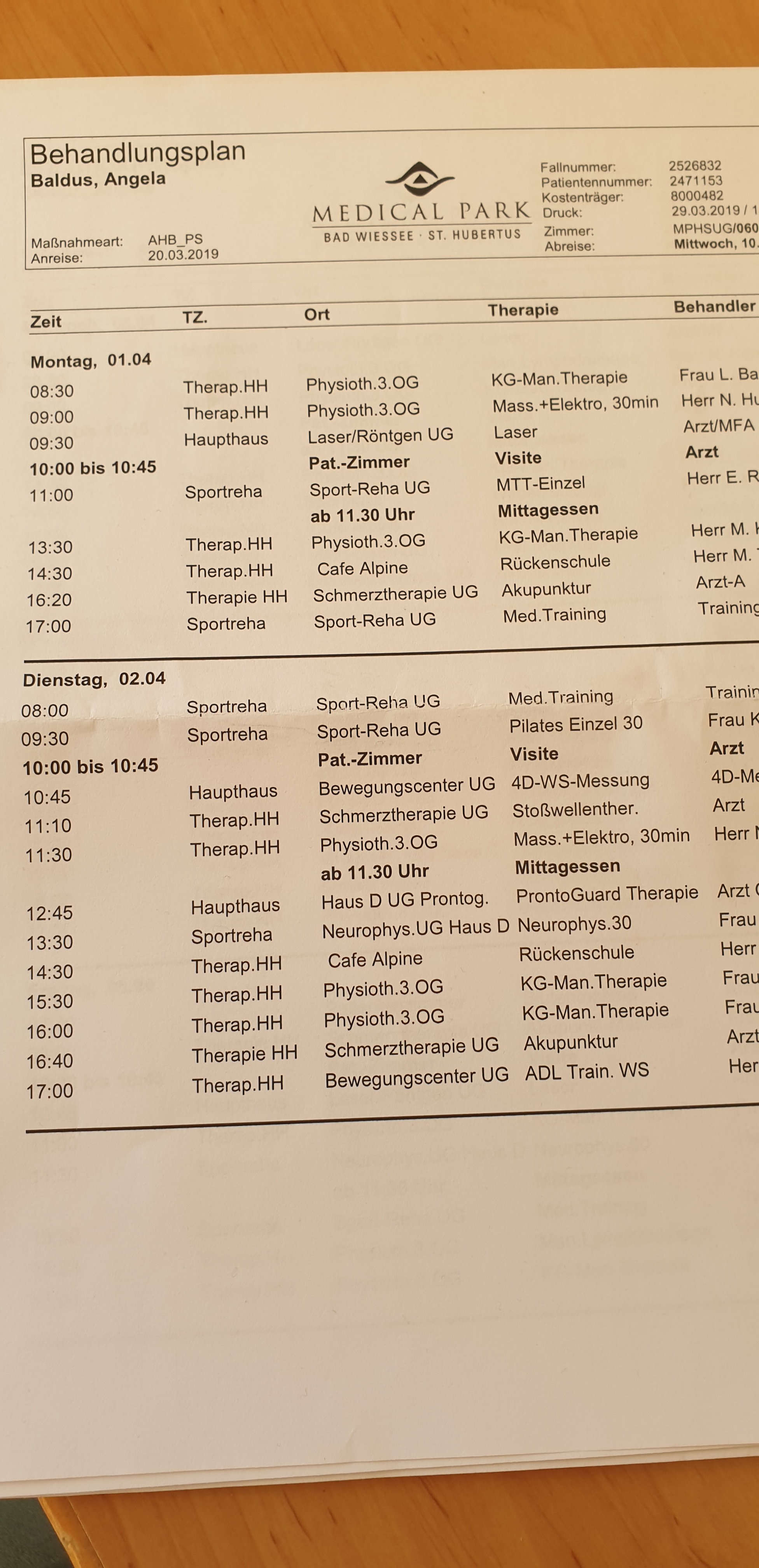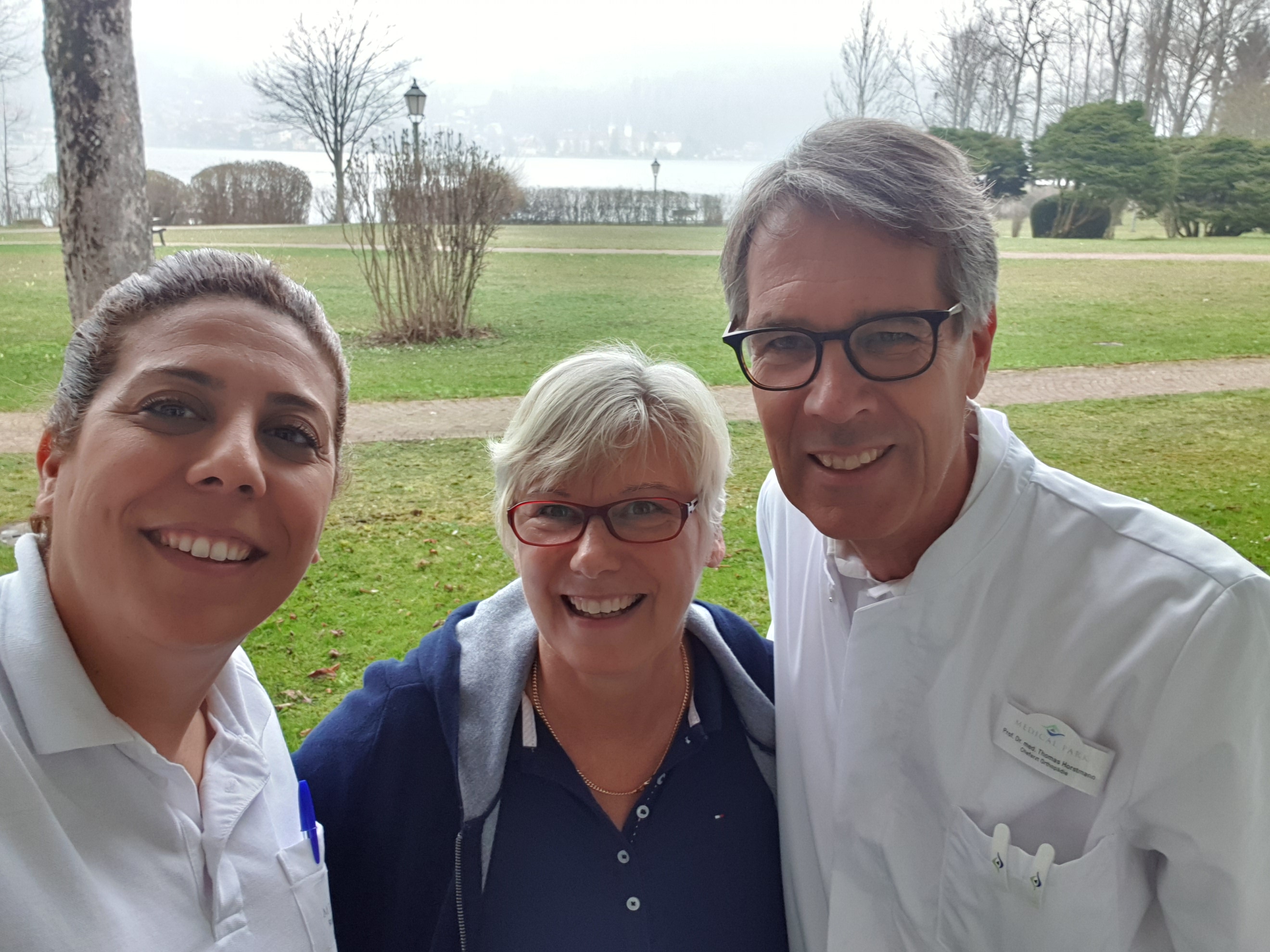 Nach 5 Tagen und zugegebenermaßen vielleicht etwas zu vielen Spaziergängen bin ich aufgrund starker Schmerzen wieder bewegungsunfähig! Der Transport in die Klinik ein einziger Horror! Die Infusionen mit normalen Schmerzmitteln bleiben fast wirkungslos. Ich bin dennoch froh, dass sich die Ärzte nach dem 3. MRT gegen eine 3. Operation und für strenge Bettruhe mit Gabe von Opiaten entschieden haben. Nach einigen Tagen absorbiert mein Körper tatsächlich die Gewebeflüssigkeit der Zyste, die sich an der OP-Stelle gebildet hatte. Falls er das nicht getan hätte, wäre ich wahrscheinlich bereit gewesen, den Rest meines Lebens als Junkie zu verbringen! Diese Opiate – wirkliche Wundermittel! Nicht nur, dass die kaum auszuhaltenden Schmerzen gut erträglich wurden, auch die Auswirkungen auf die Psyche waren erleichternd. Ich war zwar etwas verlangsamt, aber weder ängstlich noch ungeduldig, sondern eher gleichmütig und zuversichtlich. Nach insgesamt fast 5 Wochen Krankenhaus war auch mir klar, Reha muss sein. Der Oberarzt setzte sich selbst dafür ein, dass ich gleich nach der Entlassung aus der Klinik einen Platz im Medical Park am Tegernsee bekomme.