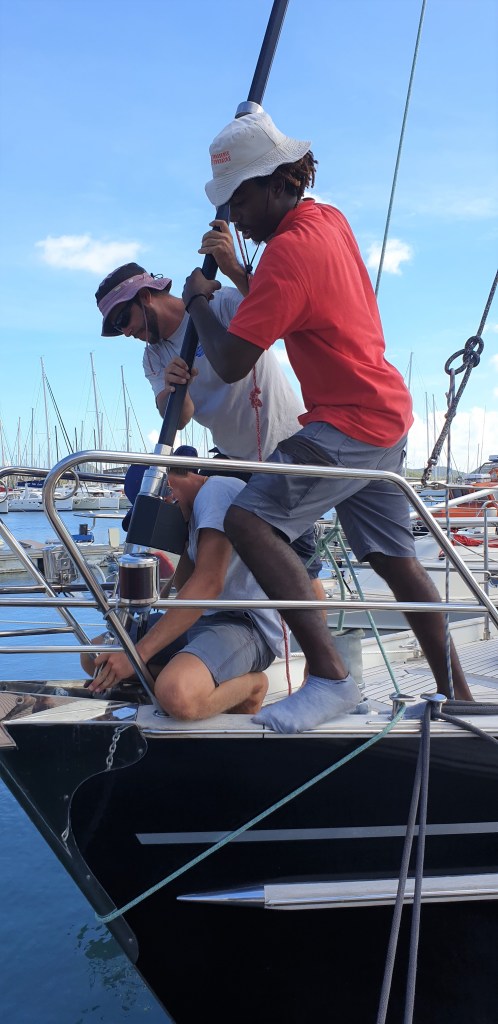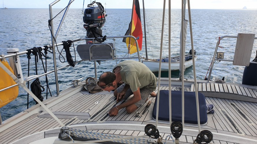 Schauen wir uns zunächst die positiven Dinge an: Die letzten 3 Monate waren wirklich schwierig und sehr belastend für uns alle, insbesondere natürlich für Angela, die das aber wirklich fabelhaft gemeistert hat. Sie ist endlich zurück an Bord und es geht viel besser als gedacht. Schon nach 2 Wochen sind ihre Bewegungen wieder ganz flüssig. Schritte und Griffe sitzen meist sicher. Ins Dinghi kommt sie problemlos, aber wenn das Boot schneller wird und ins Gleiten kommt und dabei auch nur leicht auf die Wellen schlägt, will sie stehen und die Schläge mit den Knien abfangen. (Foto folgt) Die Ängste vor Schmerzen, Abenteuer, körperlicher Belastung und Segeln sitzen immer noch tief. Schafft sie es, wieder aktiv zu segeln? Noch liegen wir vor Anker in St. Anne in Martinique und gewöhnen uns wieder an das Blauwasserleben, die Hitze und aneinander. Aber sobald der Wind wieder von Südost auf Ost dreht, werden wir den ersten Schlag gen Süden nach St. Lucia angehen.