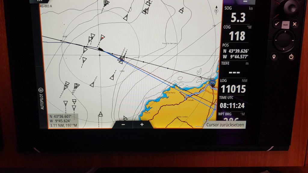 Mit unserer provisorischen Steueranlage erreichen wir A Coruna in Galizien am Abend des 8. Tag nach Aufbruch in Horta sicher. Wir segeln mit Nordwestwinden einen nördlichen Bogen um das nahe Cap Finisterre, wo sehr starke Winde herrschen sollen. Sebastian von Wetterwelt und Uwe von TransOcean/Intermar geben uns jeder zweimal täglich per Funk höchst präzise Wetterinformationen und Richtungsempfehlungen. Ziel ist es, mit möglichst wenig Ruderbelastung an unser Ziel kommen, und dabei das vorgelagerte dicht befahrene Verkehrstrennungsgebiet nördlich zu umfahren, um keine Ruderbelastenden Ausweichmanöver fahren zu müssen. Vermutlich unnötig, denn unser provisorische Ruderstange ist super stabil.