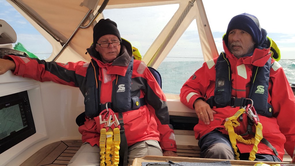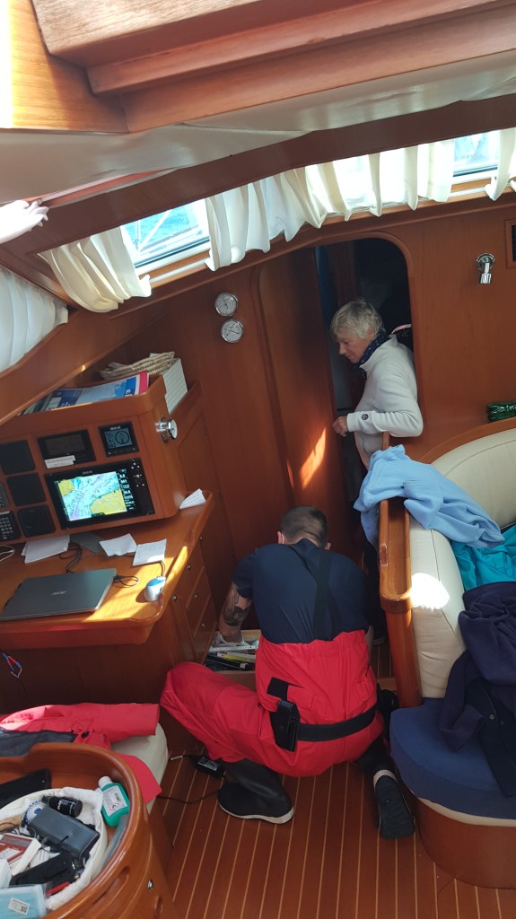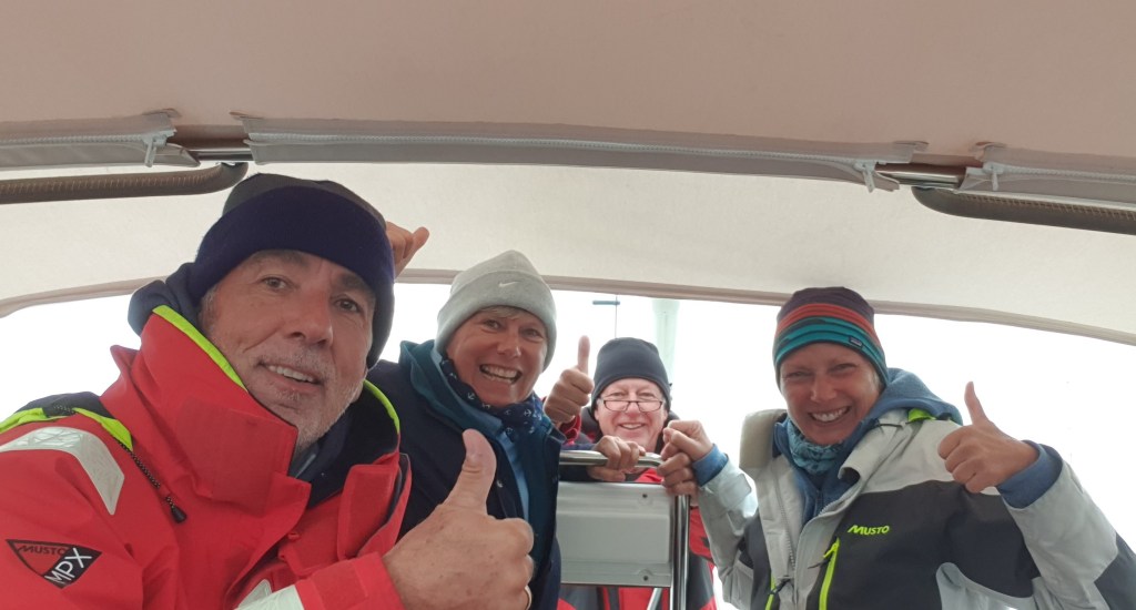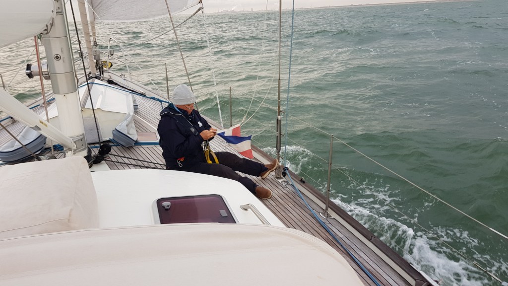 Wir preschen voran. Der Wind lässt zwischendurch nach und wir motoren. Es ist mal wieder Morgen. Der Regen hat aufgehört. Graue Wolken kräftiger Westwind, aber die Sonne beginnt sich zu zeigen. Graues aufgepeitschtes Wasser. Wir haben Bologne sur Mer querab und nähern uns der Engstelle Calais – Dover. Die Schnellfähren queren unseren Weg in raschen Abstand. Wir sind das erste Mal wieder alle im Cockpit zum Frühstück, weil endlich kein Regen mehr ist. Alle dick verpackt.