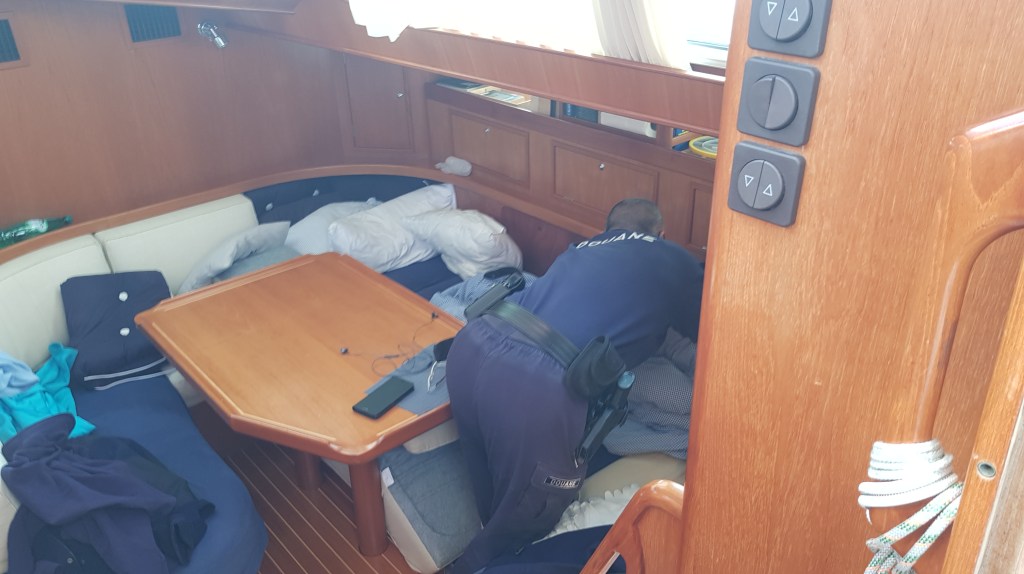 Per Kran lassen sie ein Schnellboot zu Wasser. Eine Truppe von Männern springt in das Boot, alle voll bewaffnet. Ihr Speedboot kommt an Steuerbord längsseits mit vollen Speed. Geschickt klettern 5 (!) Mann durch die geöffnete Reelingspforte, 2 bleinben im Beiboot. Ich heiße sie seemännisch und formell in Französisch an Bord willkommen. Der Kommandant klärt uns auf, dass sie vor allem auf Suche nach Drogen, Geld und Alkohol wären, es aber eine Routineinspektion sei. Während ich mit dem Kommandanten die Routineaspekte einer Zollinspektionen kläre, geht die Truppe und die Crew unter Deck und nimmt das Schiff teilweise auseinander. Aber alles tadellos. Keine Schikanen. Sie schauen vorsichtig in Schapps und unter Bodenbretter. Aber nichts wird durchgewühlt. Auch der Motorraum wird angeschaut. Ob sie denn nicht auch in den dahinterliegenden Elektro- und Pumpenraum gehen wollen, hier wäre der Schlüssel, fragt Angela. Nein, erwidert einer der Männer, das wäre wohl nicht nötig. Recht schnell sind 2 von den Männern wieder an Deck, die anderen folgen recht zügig. Leichenblas und schwitzend. Ziemlich heftig die Welle, meine ich zu ihnen. Sie nicken zustimmend. Jungs, seid ihr tatsächlich seekrank??? Oui! (Ja), erwidern sie.