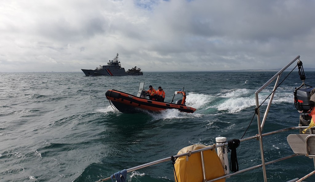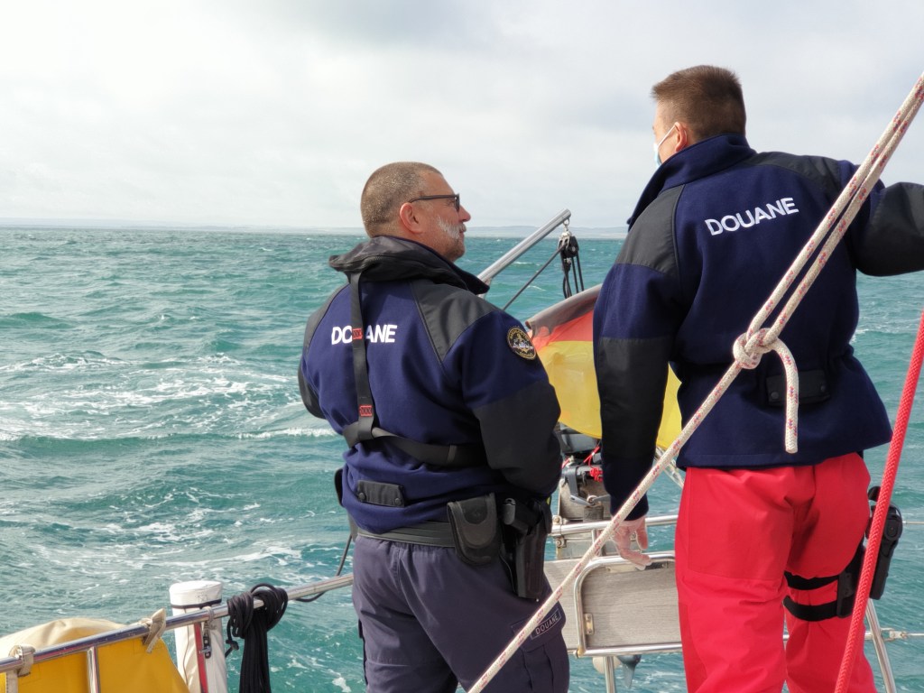 Ein graues Schiff hält achteraus auf uns zu. Wir bemerken es zunächst kaum. Ist wohl ein Fischer. Seltsam, dass der kein AIS-Signal abgibt. Dann nimmt er Fahrt auf, was wir an der Bugwelle sehen. Wir prüfen mit dem Fernglas das Schiff. Es ist ein französisches Marineschiff, später stellt sich heraus es ist der französische Zoll. 1 Seemeile hinter uns kommt dann prompt der Anruf per Funk. Wie wir es schon von Martinique kennen, klären wir alle Details über Schiff und Personen an Bord. Dann kommt die Ansage, dass sie zu an Bord kommen werden. Mittlerweile ist das Boot querab 100m von uns. Wir sollen Kurs und Geschwindigkeit halten. Wie soll das denn gehen? Wir preschen gerade knapp mit Rumpfgeschwindigkeit unter Segeln durch Wellen mit fast 2 Metern. Nun ja. Wir bereiten alles vor.