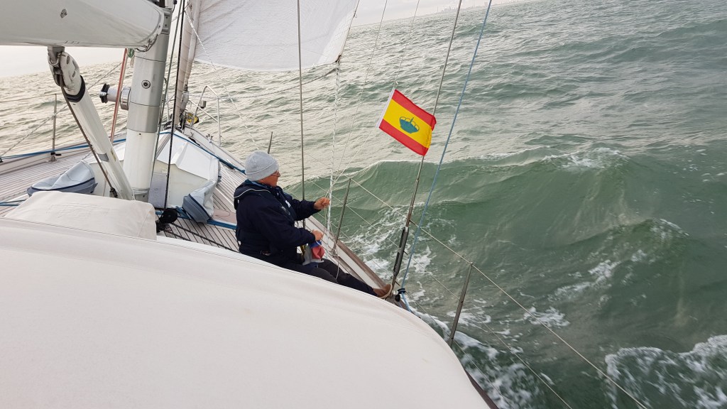 Für uns geht es weiter. Richtung Ijmuiden. Wir zählen die Meilen. Nach der Meerenge Calais – Dover nimmt der Wind nochmal ordentlich zu auf 30 kn, eine steile Welle mit über 3 Metern macht es wirklich ungemütlich. So ungemütlich, dass einmal sogar das gesamte Geschirr, was spülbereit im Spülbecken liegt wie von Geisterhand herausgehoben wird und mit Wucht in Küche knallt inklusiv scharfer Messer und schweren Pfannen. Tina, unser Smutje, bringt sich mit einem Sprung in Sicherheit und flucht heftig und lautstark, ganz entgegen ihrer sonst so ausgeglichenen Art. Die Nordsee zeigt ihr Kräfte. Die Situation dauert noch fast bis Ijmuiden an. Eine halbe Nacht länger als kalkuliert.