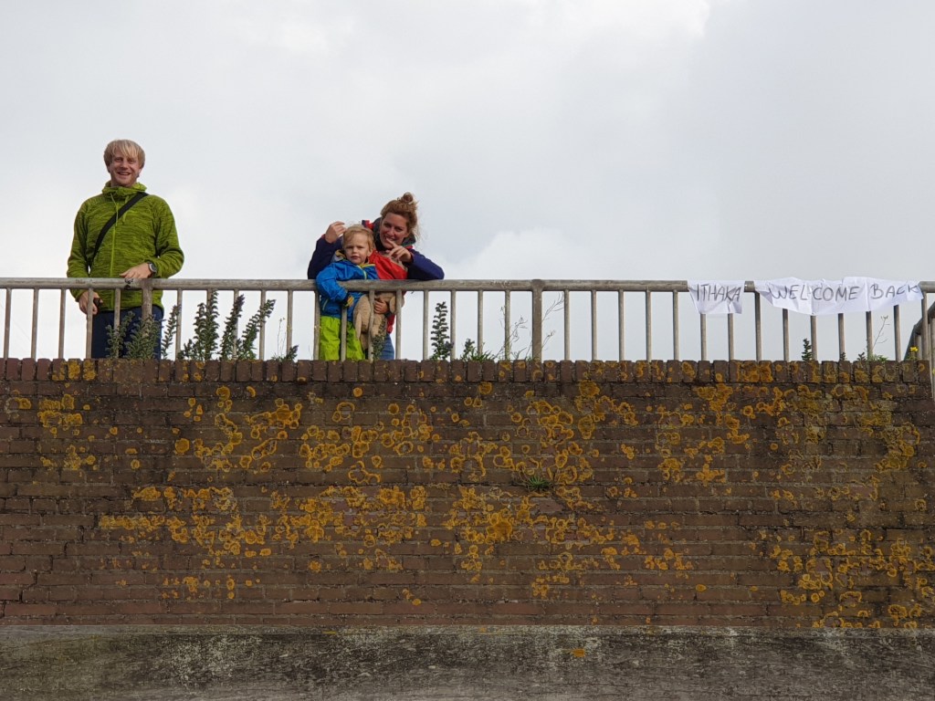 Am 1. Juli um 7.45Uhr Uhr erreichen wir die Seaport Marina Ijmuiden. Seltsam, hier sind tatsächlich schon Leute wach und winken uns zu! Beim Näherkommen erkennen wir sie. Es sind tatsächlich Kira (Berns Tochter) und Jan mit dem kleinen Ole, die um 3 Uhr in der Nacht von Wuppertal losgefahren sind, um uns zu begrüßen. Sie haben ein Transparent aufgehängt „Ithaka. Wellcome back!“ und winken. Jetzt haben wir alle Pfützken in den Augen.