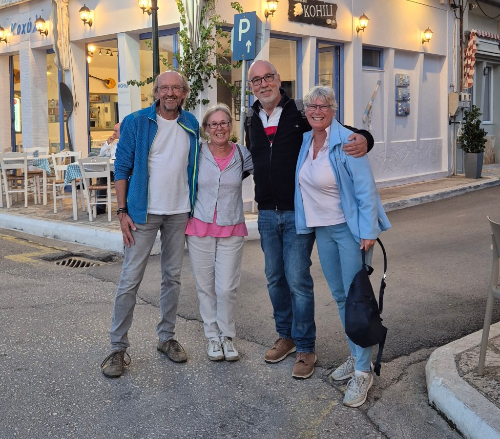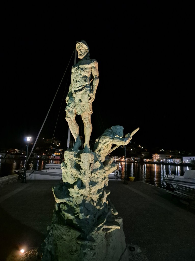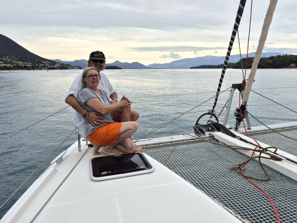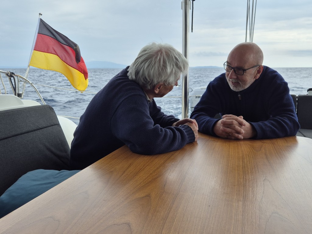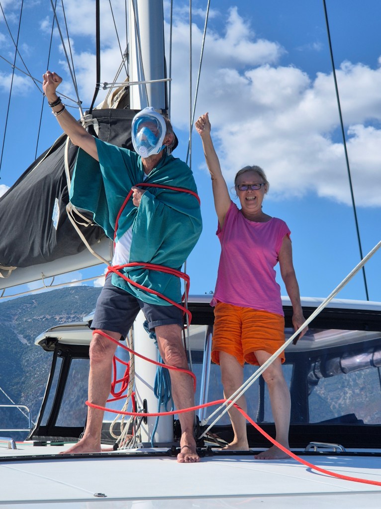 Weiter im Süden ist es mit dem stürmischen Wetter fast vorbei. In Lefkas kommen unsere Freunde Doro und Friedrich an Bord. Die absoluten Landratten brauchen zwar etwas Zeit zur Akklimatisierung, erweisen sich aber nach kurzer Zeit als begeisterte und einsatzfähige Crew. Ein Flautentag rund um das geschichtsträchtige Ithaka wird genutzt, um für Enkelin Klara die griechischen Mythologie aufleben zu lassen: Odysseus ist am Mast gefesselt und schreit, während der Skipper das Schiff mit Wachs in den Ohren weiterführt, um es nicht – durch die verführerischen Klänge der Sirenen fehlgeleitet – auf die Klippen zu setzen.