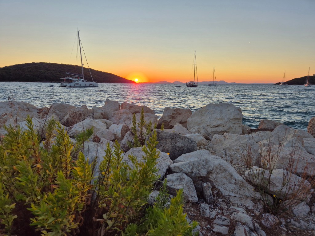 Glücklicherweise ist noch Vorsaison, so dass wir meistens etwas abseits doch noch einen guten Ankerplatz finden. Und dass man mit dem Dinghi auch mal längere Distanzen überwinden kann, haben wir in der Karibik gelernt. Dass wir manchmal selbst für das freie Ankern zur Kasse gebeten werden, zeugt für uns vom inzwischen überaus kommerziellen Charakter Kroatiens. Marinas laufen wir mit unserem breiten Katamaran wirklich nur in Notfällen an, dann schlagen wirklich heftige Hafengebühren zwischen 150 und 200€ pro Nacht auf. Das Festmachen an den Stegen vor den Konobas (Buchtenwirten) ist zwar kostenlos und wirklich nett, dafür ist dann das Essen umso teurer.