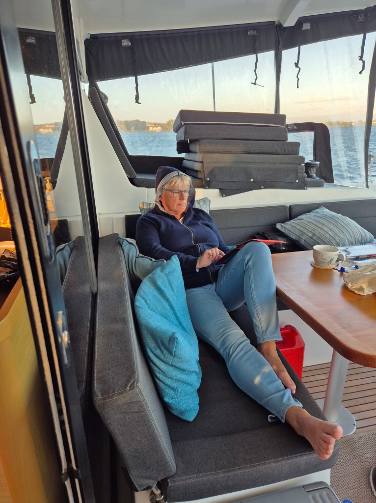 Vor dem Wind preschen wir unter kleinsten Segeln nach Süden Richtung Lefkas und Ithaka, dort gibt es geschützte Buchten. Und Bora Bora II zeigt, dass sie fast auch fliegen kann, wenn nur die Windrichtung stimmt und die Welle von hinten kommt. Wir ziehen unsere warmen Segelklamotten an und genießen die Rauschefahrt. Dass die Teetassen dann trotzdem auf dem Tisch stehen bleiben, ist ein noch ungewohnter, aber netter Nebeneffekt unseres Katamarans!