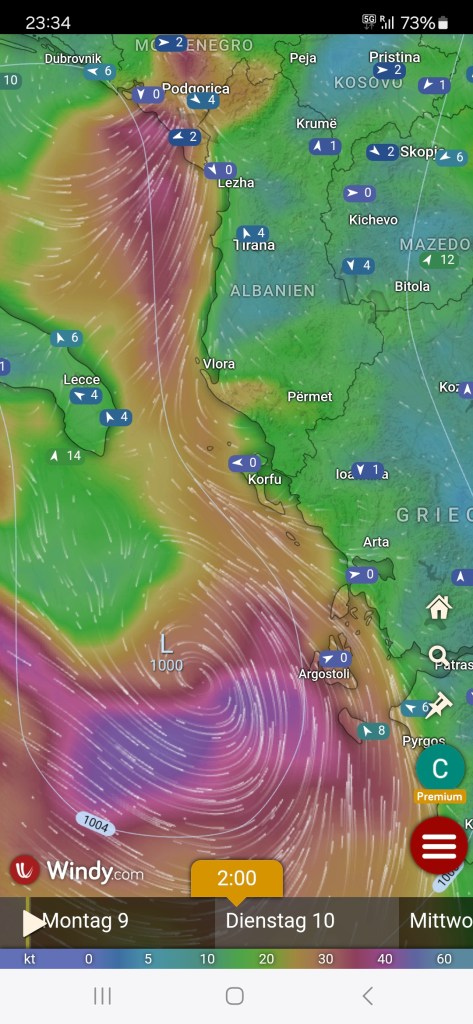 Nach einem schnellen ersten Erkundungsschlag gen Süden bis Zakynthos geht es rasch wieder gen Norden nach Korfu. Dort haben sich Sohn Jonas mit Partnerin Marthe und Enkelin Lotta für eine Woche an Bord angesagt. In Vorfreude hatte Oma schon die passenden Windelpakete und einen Klemmhochstuhl im Gepäck, Opa die kleinste sichere Schwimmweste bis 10 kg Körpergewicht! Aber es kommt anders als gedacht. Das Wetter wird richtig gruselig. Wir erleben eklige Frontensysteme mit Cyclonen (schnell drehendes Tiefdruckgebiet) mit heftigen Gewittern, Regen, Starkwind sowie Superböen und Wellen, die wie in der Nordsee hoch, kurz und steil sind. Beim Durchzug dieser Wettersysteme drehen dann Wind- und Wellenrichtung, wodurch eine zunächst gut geschützte Bucht zu einer offenen Bucht wird, in die Wind und Wellen voll reinpeitschen. Das ist dann nicht nur sehr ungemütlich, sondern auch gefährlich, weil das Schiff auf Legerwall ist und bei nicht haltendem Anker auf Land getrieben würde. In der geschützten Marina ist kein Platz zu ergattern, obwohl wir wirklich jeden Preis gezahlt hätten. Eindeutig keine Bedingungen für eine Crew mit einem gerade einjährigen Kleinkind! Schweren Herzens wird der Besuch abgesagt. Nach Nächten, die uns vor Anker richtig durchgeschüttelt haben, nehmen wir das nächste mögliche Wetterfenster und verholen uns Richtung Süden.